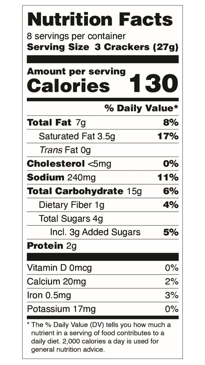 Crackers: WHOLE WHEAT FLOUR, WHEAT FLOUR, CANE SUGAR, PALM OIL†, MALT EXTRACT, SALT, BAKING SODA, BAKING POWDER, YEAST.